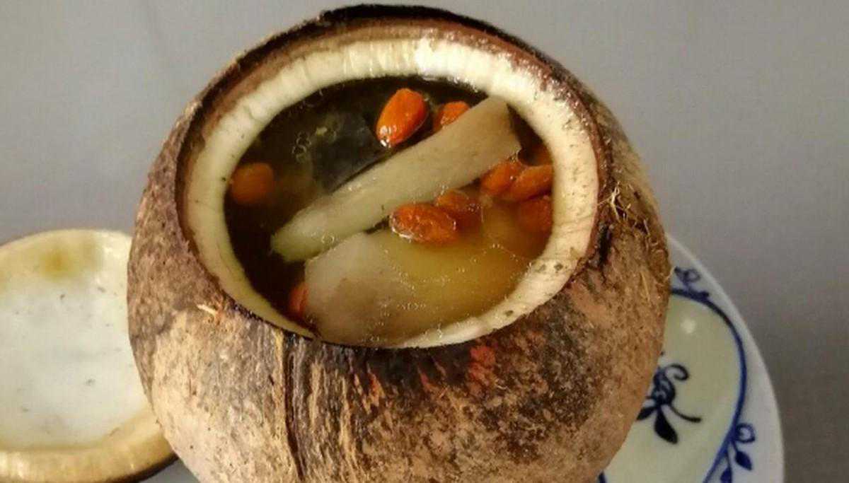 制作这道美食时,要准备椰子、乳鸽、人参、枸杞等食材,在椰子蛊中放入准备好的原料,再用慢火炖煮几个小时,经过了如此漫长的炖煮,所有食材也都充分融合到了一起,打开盖子,就有一股椰香扑面而来,让人顿时觉得心情极其舒畅。