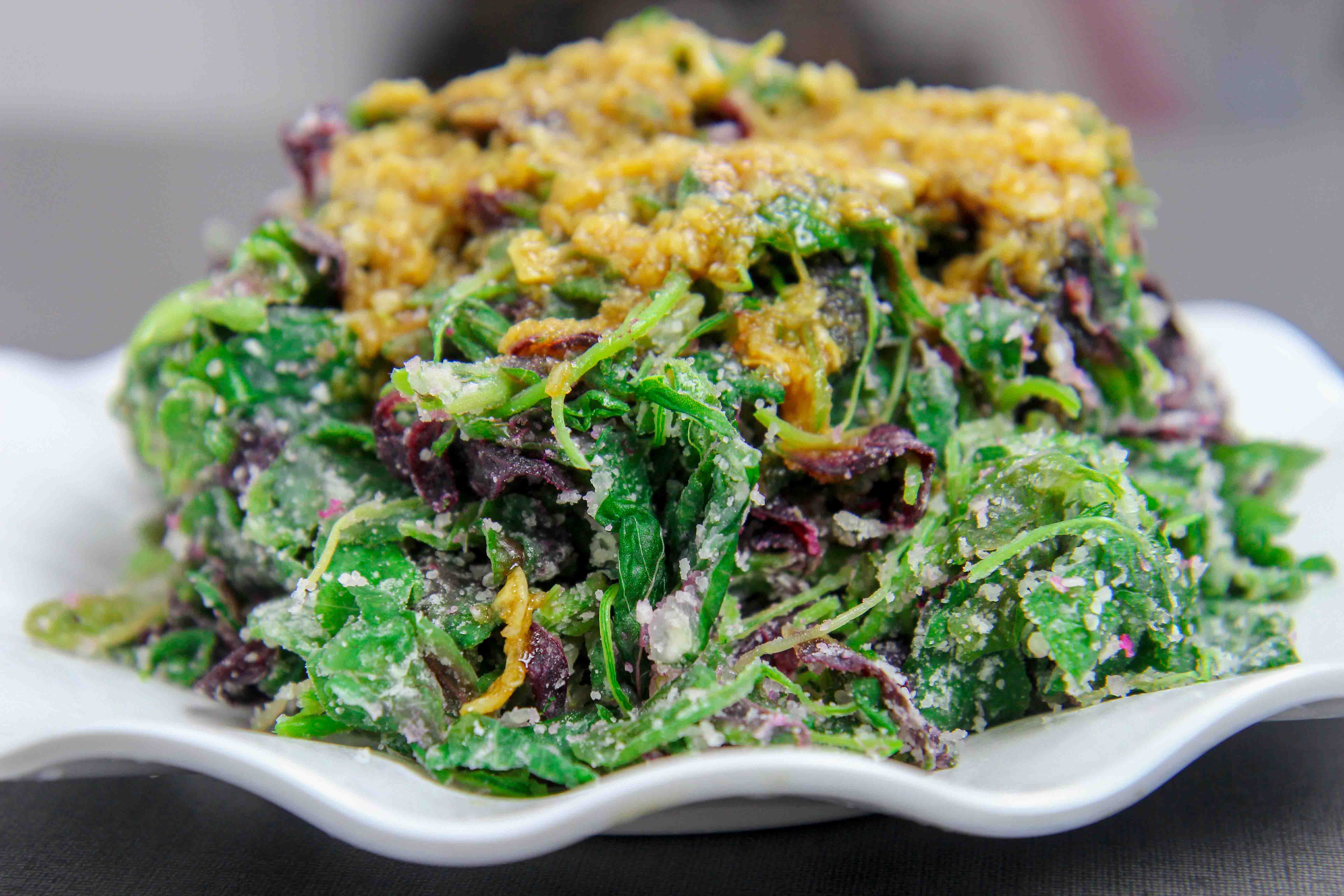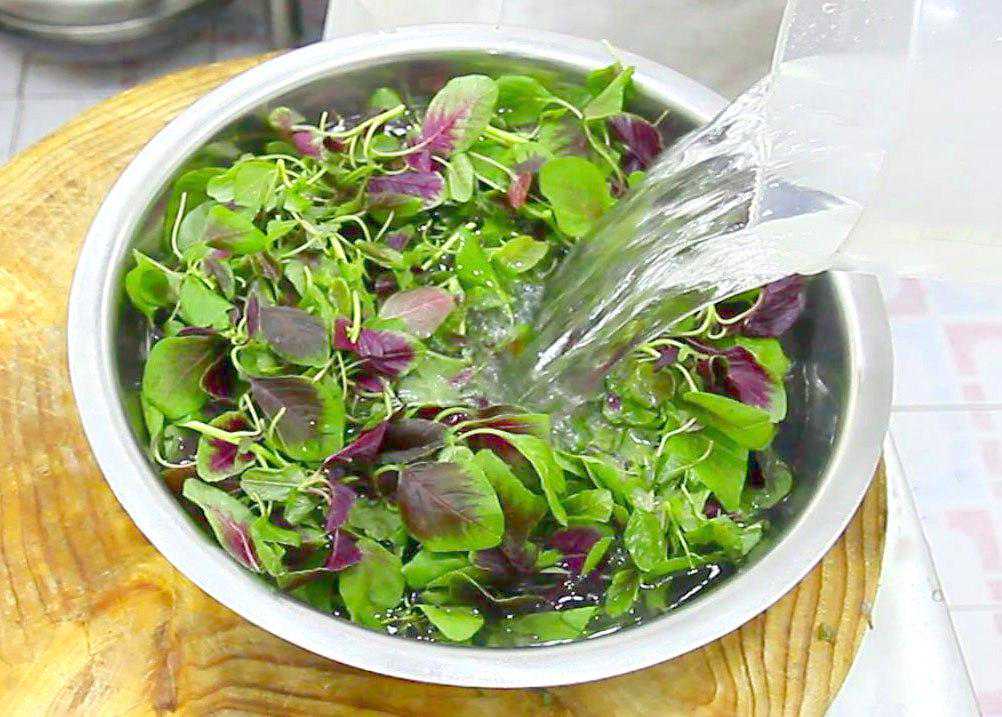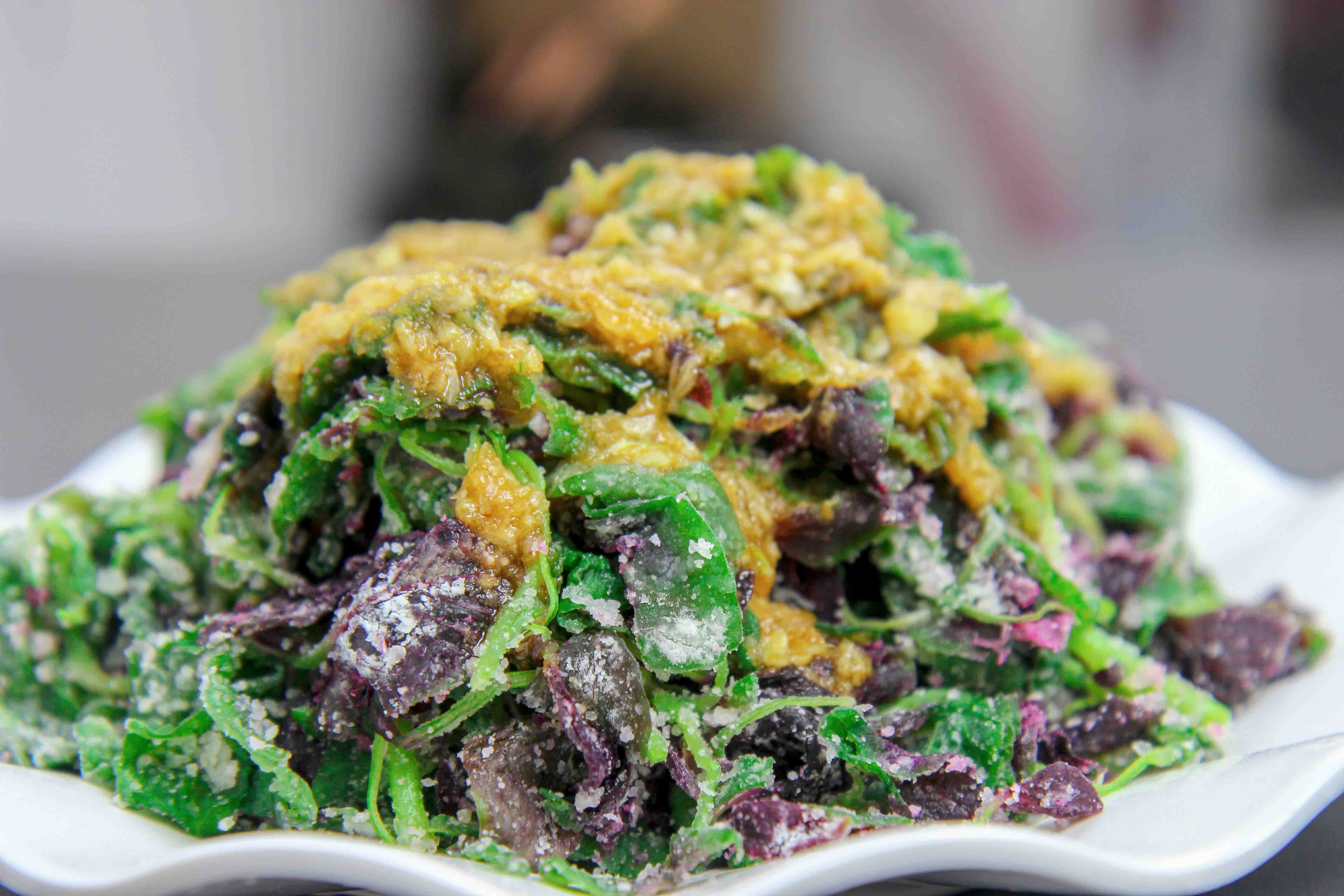 一把苋菜,摘下嫩叶,放在盆里。加入清水洗净,多清洗几遍,然后控干水分。把苋菜控干水分后,放在盆里加入植物油,用手抓匀。然后再放入面粉,搅拌到看不到绿叶为止。