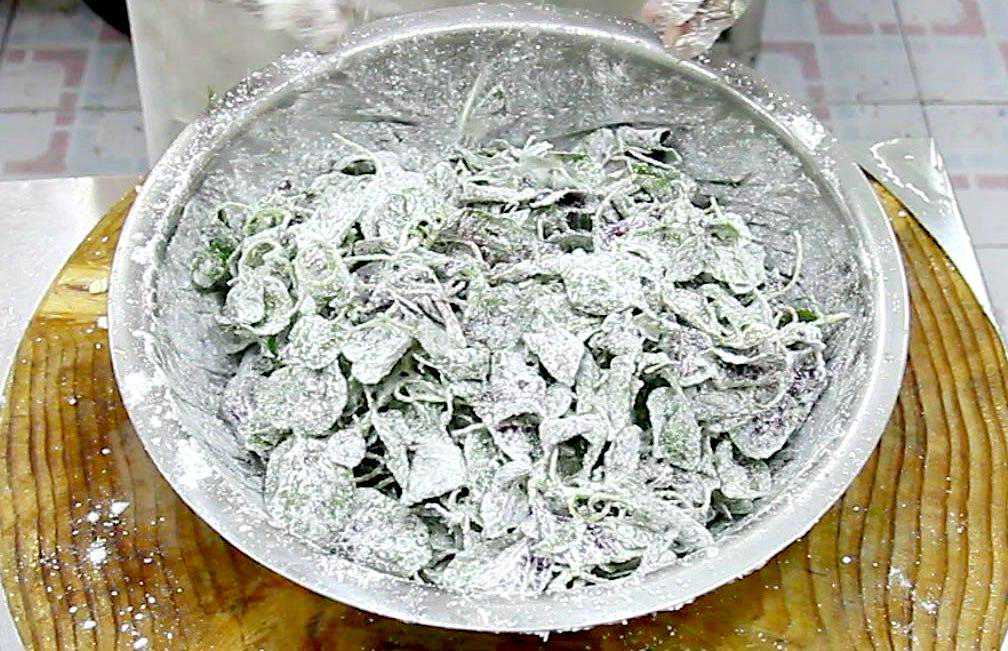 锅内烧水,放上蓖子,盖上锅盖,开大火,把水烧开后,放入拌好面粉的苋菜叶,苋菜非常好熟,一般蒸三分钟左右就可以了。
