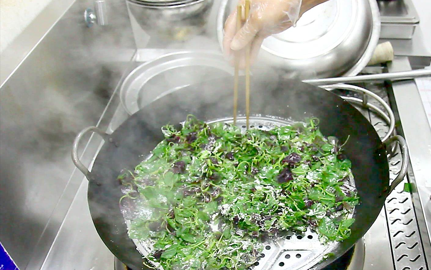 三分钟后,把蓖子端出锅,把苋菜叶倒入盆中抖散,一定要在温度没有凉下来之前拌散。撒上一点食盐,颠盘拌匀后,装在盘里。