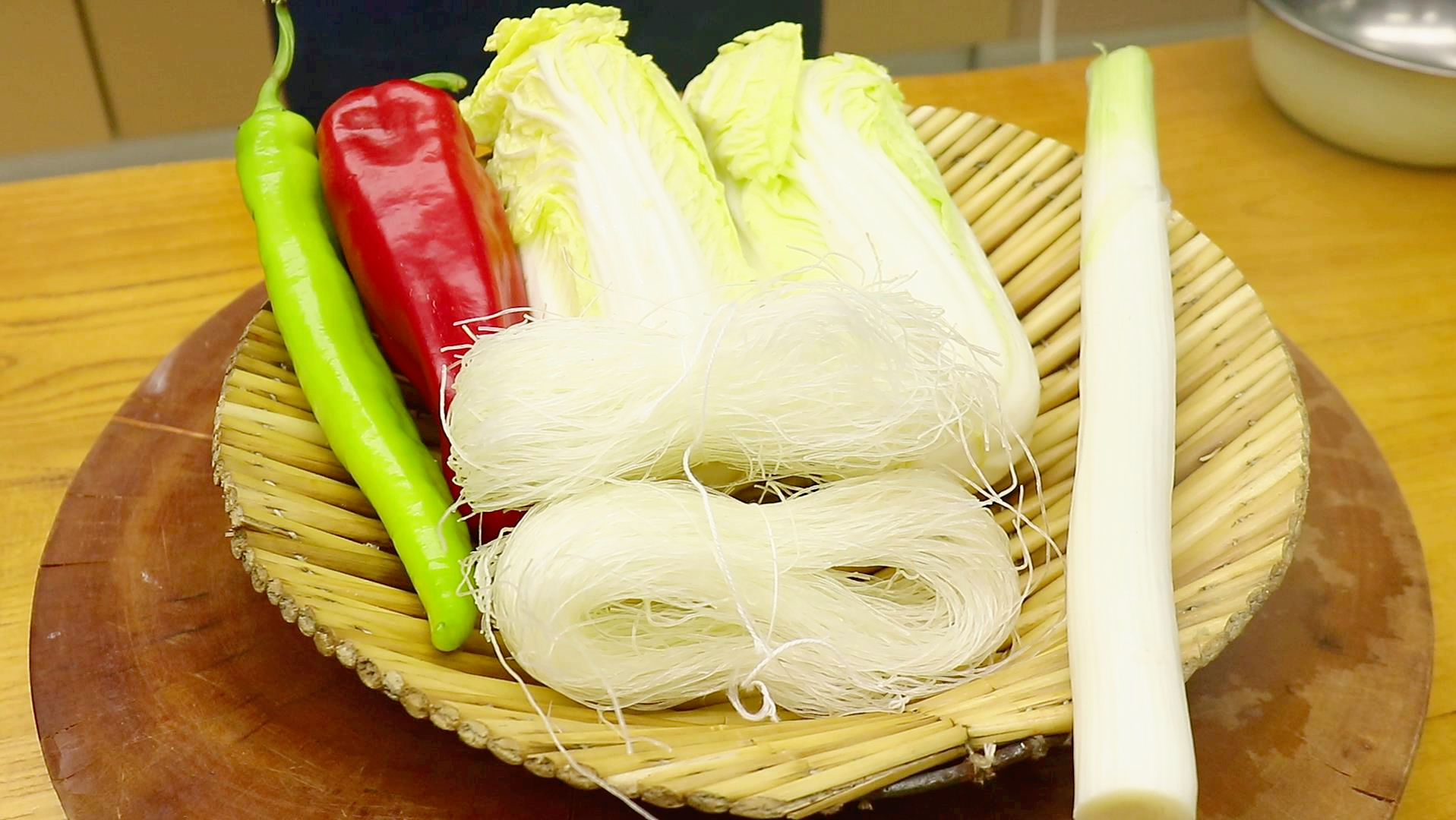 趁着这个时间,切一点配料。大葱去除硬芯,切成丝。青红椒各半个,把籽去除,也切成丝。一起放入清水中抓洗干净后,浸泡一会。