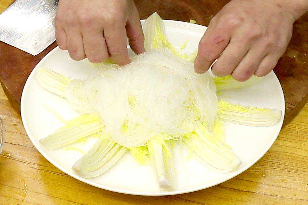准备两把粉丝,用温水泡发。娃娃菜2颗,分别破成几半,把茎和叶分开。根茎围着盘子摆一圈,叶打散放在中间。