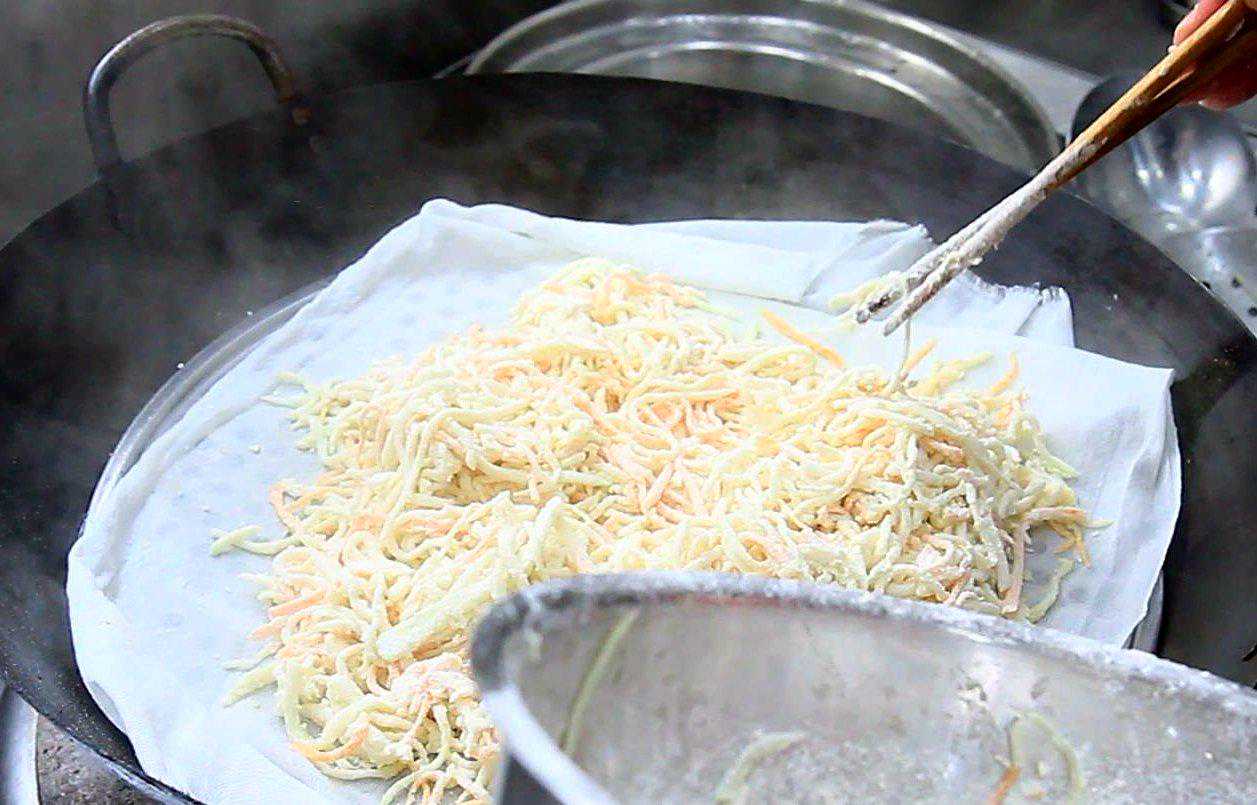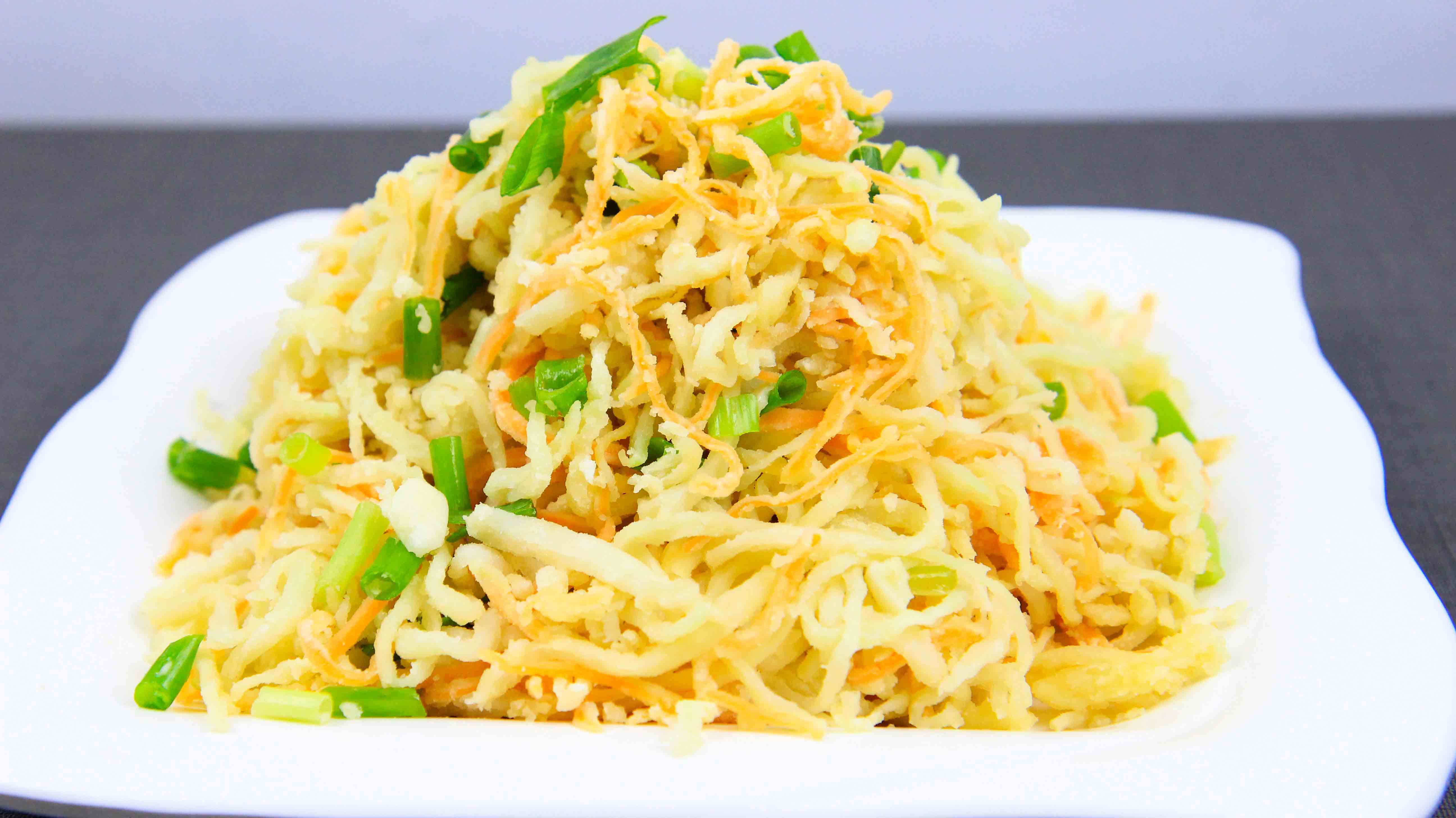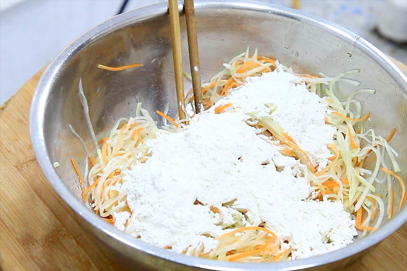 准备两个土豆,一根胡萝卜。全部削去外皮并且切成细丝,根据自己的刀工,越细越容易入味。切好以后放入食盐3克,把萝卜丝杀一下水分。然后倒在笊篱上面,挤一下里面的水分,擦干。