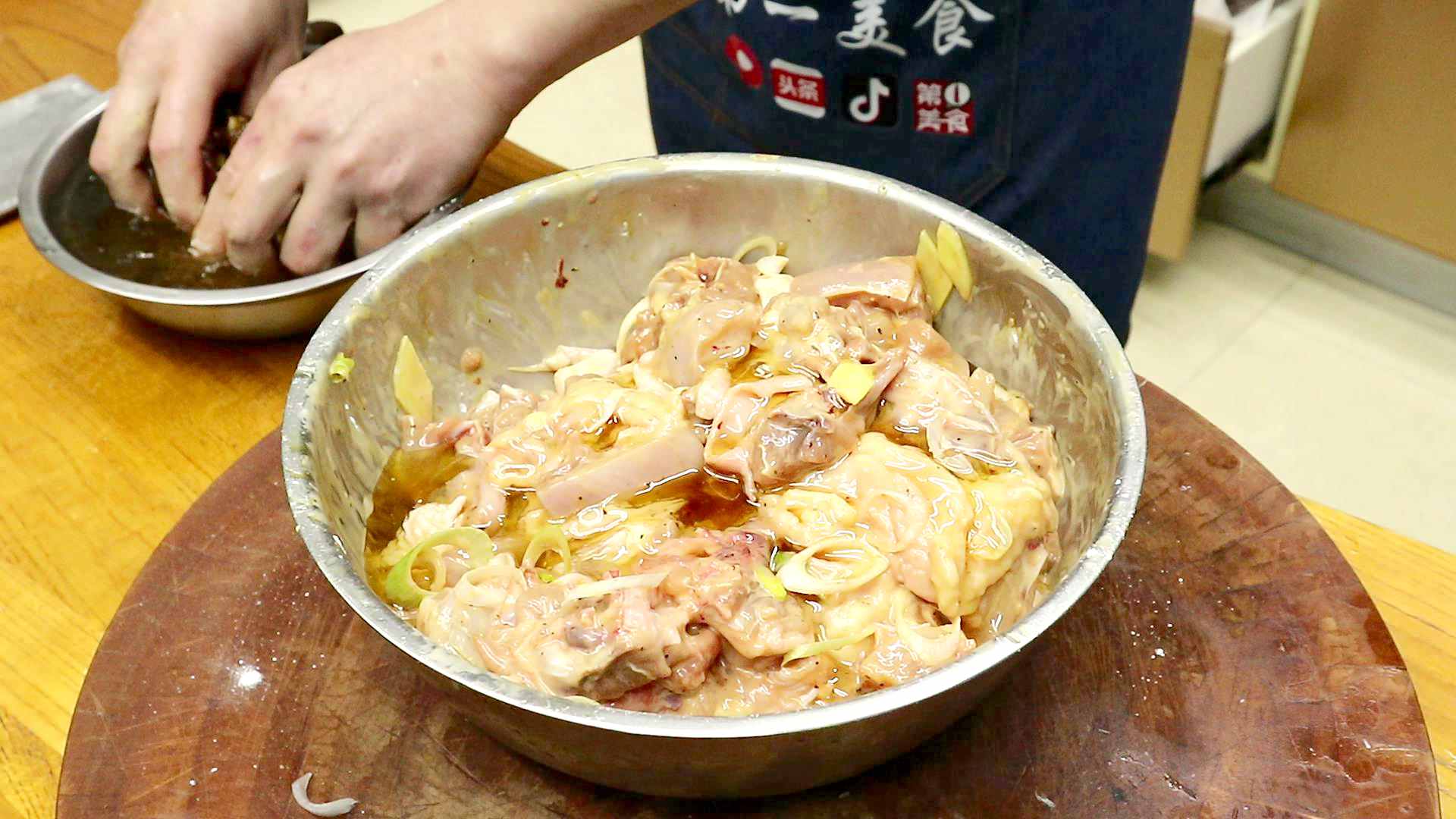 大葱切成片,生姜切成菱形片,和鸡块放在一起。加入食盐、味精、白糖、鸡粉、黑胡椒、蚝油,用手抓揉一会,让鸡块吸收调料入味。