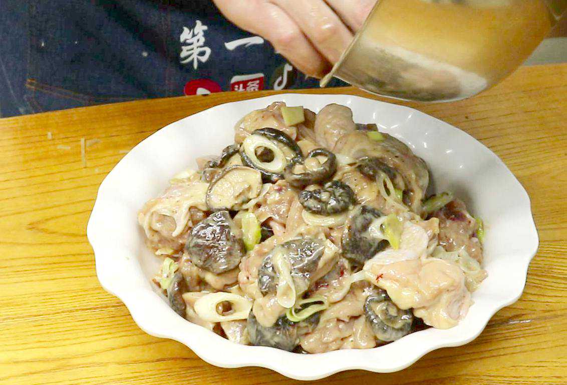 再淋入一些生抽提鲜,撒入一小把淀粉,淋入一些植物油,防止粘连。把泡软的香菇挤干水分,和鸡块放在一起,再次抓匀。