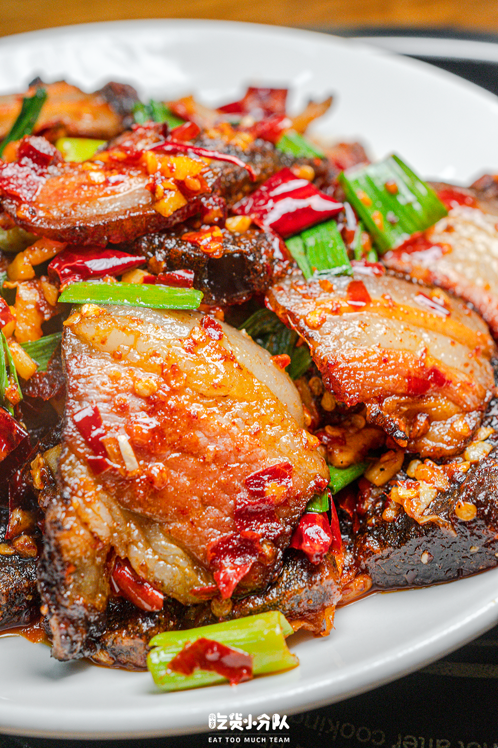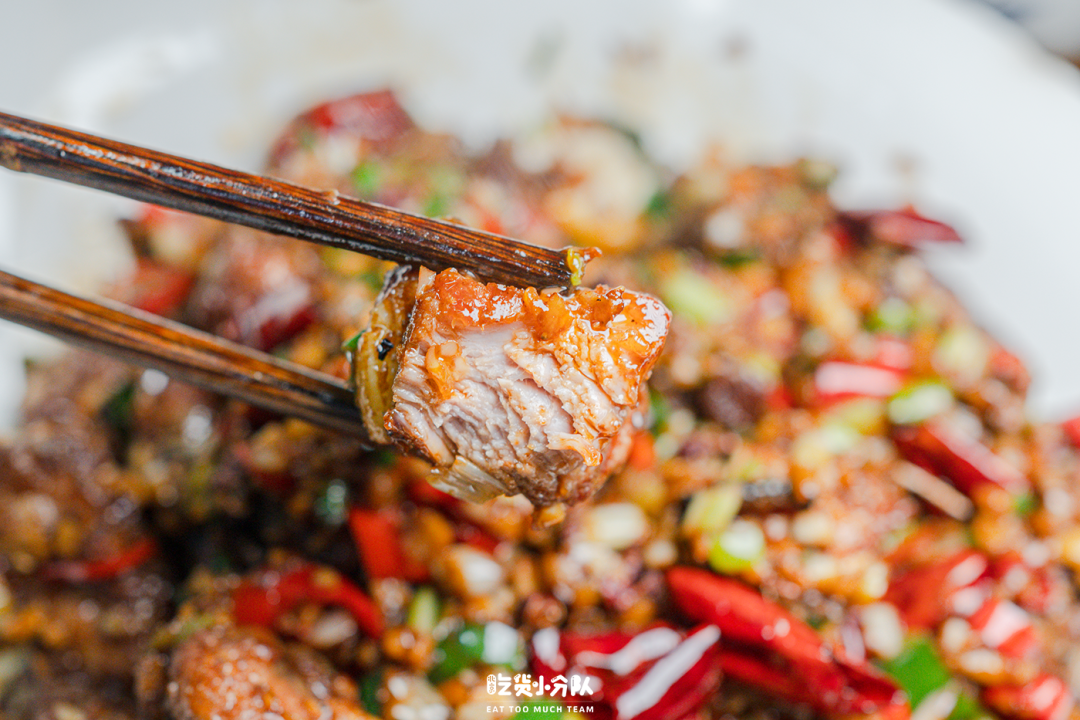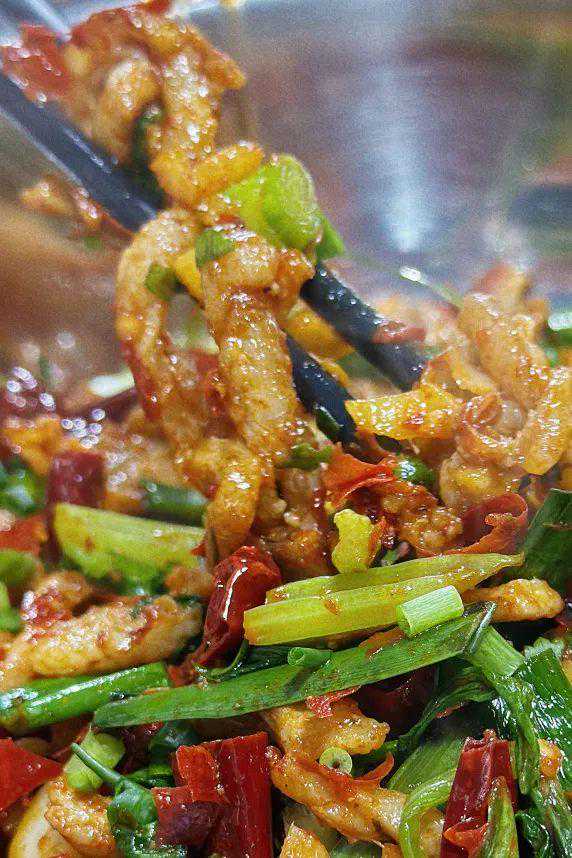 鸡肉也是炸得偏硬的质地,每块儿都跟香喷喷的红油全方位无死角地亲密接触,嚼起来是恨不得把骨头都吃了的那种麻辣酥脆!不过这道菜里小碎骨确实挺多的,吃的时候注意别硌了牙。