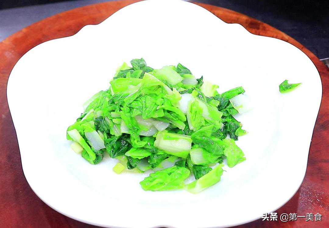 热锅凉油,放入葱花翻炒出香味,放入小白菜段翻炒一分钟左右,小白菜塌软以后,加入少许食盐再翻炒均匀,盛放在盘中垫底。