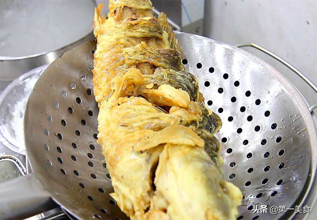 锅内烧油,油烧至五成热,提着鱼尾先把头炸一会儿,这个时候不停地往鱼身上浇热油,让鱼片展开,鱼片定型以后轻轻地放入锅中,开小火炸制,炸的时候最好不要翻动鱼,以免影响定型,不停地用热油浇鱼头、鱼尾和露出油面的地方,大约炸制7-8分钟,鱼身炸透、炸成金黄色时倒出来控油。