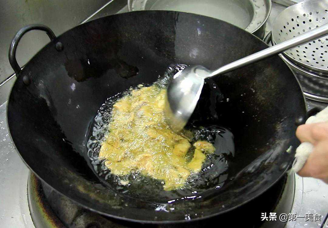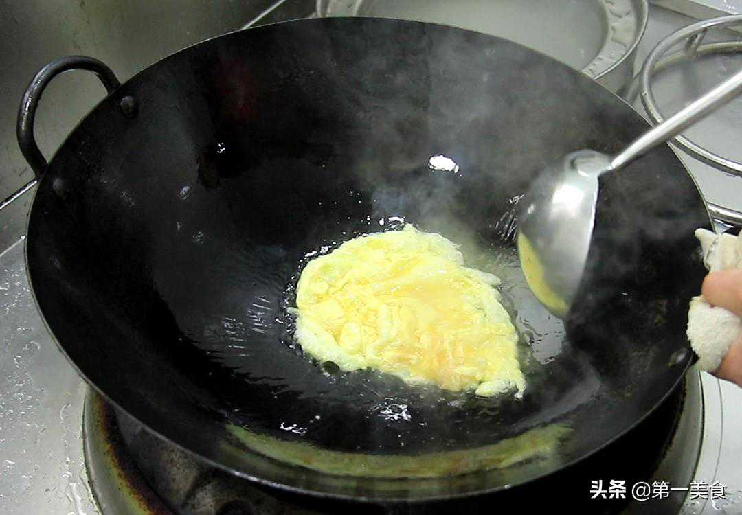 锅内再烧油,充分滑锅以后倒出热油加入凉油,把蛋液倒入锅中,鸡蛋炒熟、炒定型以后,用勺子打散倒出备用。