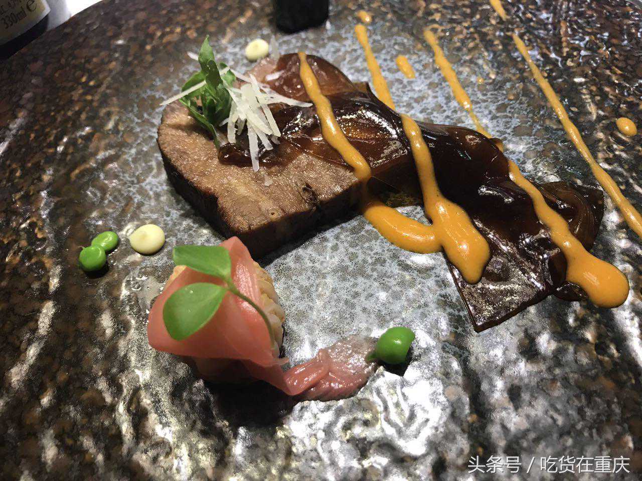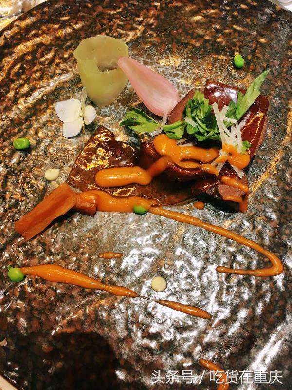 一份普通的牛舌,大厨“鑫哥”会用川式的味型加入简单的分子技术,花8个小时来低温慢煮,上桌时,搭配爽口的腌黄瓜,夏天还要配上腌子姜片,一荤一素,一浓一淡,既能品到牛舌的浓香之味,又不会被腻在其间。而且,这道菜还结合时下流行的分子料理,将卤牛舌的汁做成一片汁冻,覆盖在牛舌表面保持牛舌的原汁原味,薄如山楂片,搭在牛舌肉上,显出精致优雅的模样。