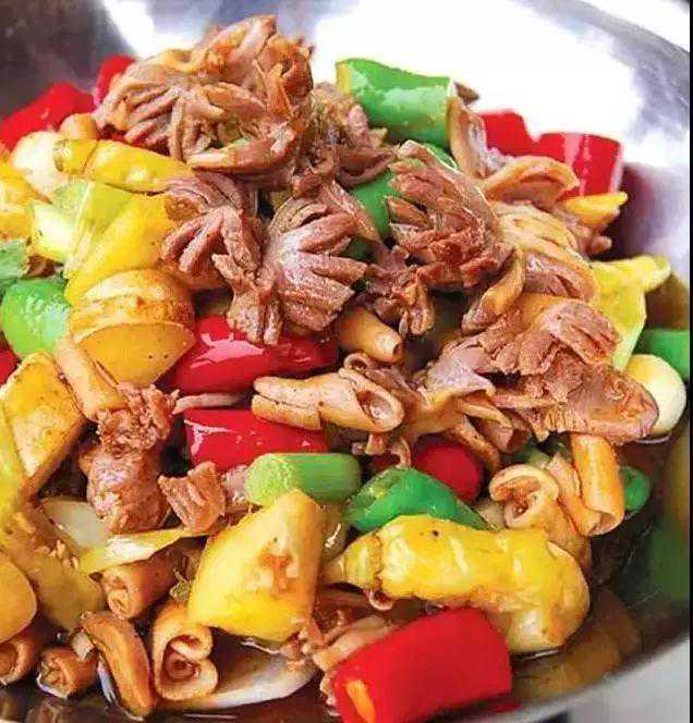 3.锅入油烧热,先下红油豆瓣和泡椒末炒几下,再把鸭肠、鸭胗、鸭心和鸭肝放进去炒2分钟,待投入青椒块、红椒块、野山椒段、蒜薹段和大蒜瓣后,续炒2分钟并加盐、鸡精、味精、白糖和香醋,炒入味便装入干锅内上桌。