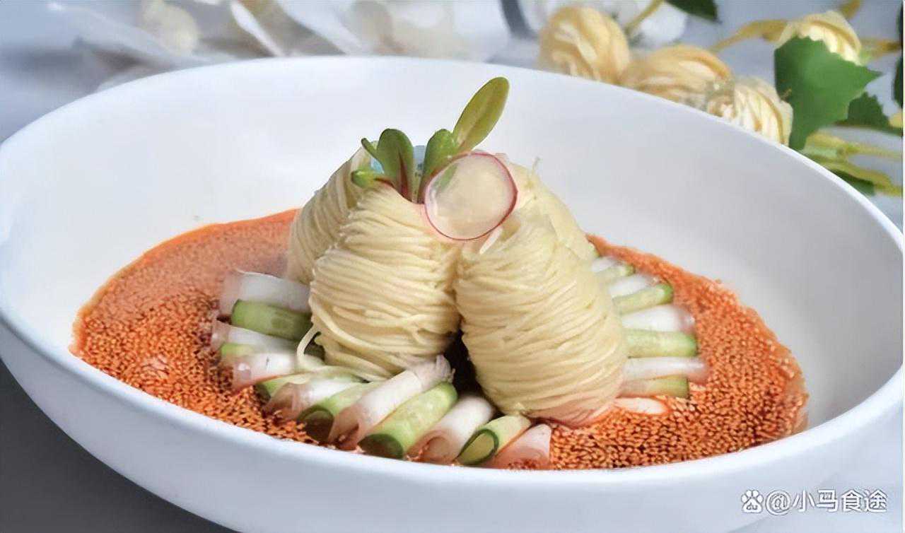2.细水面煮熟后捞出沥水,拌匀菜籽油,用风扇迅速吹凉,卷成4卷,立在肉片和乳瓜片上。