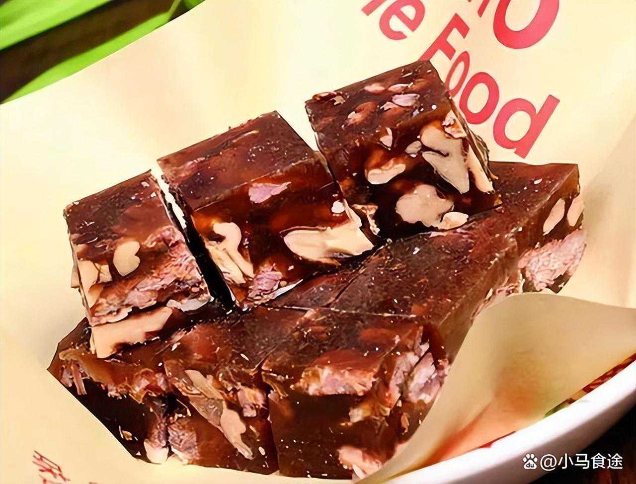 此菜由猪肉冻改良而来,却并非是卤制而成,而是将牛肉放进高压锅内制熟入味,然后倒在托盘中,再与去皮核桃一同凝固成冻,成菜似天然琥珀,晶莹透亮,洁白的核桃仁点缀其间,牛肉软烂入味,口感爽滑Q弹,推出后广受食客喜爱。