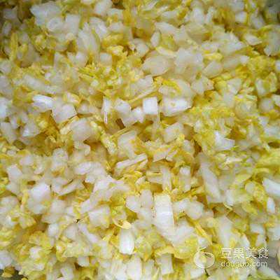 2、娃娃菜洗净切成小丁加少量盐拌匀静置几分钟,挤干水分备用