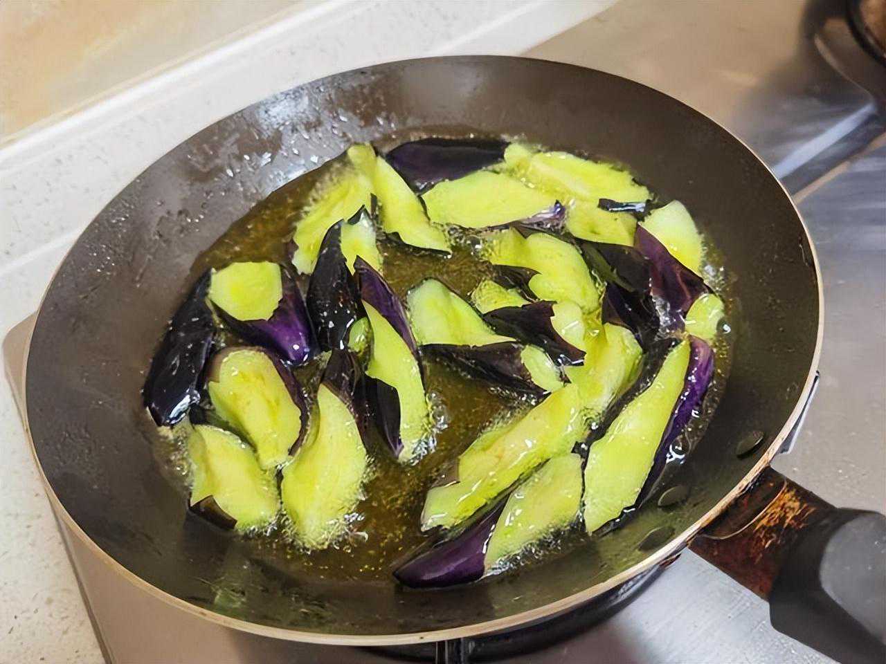 4、把其它两样蔬菜炸好,接着再放入茄子,炸3分钟左右,用中小火加热,中间多多翻几次面,保持受热均匀,等时间到了,捞起控油,切蒜末、调一个料汁。