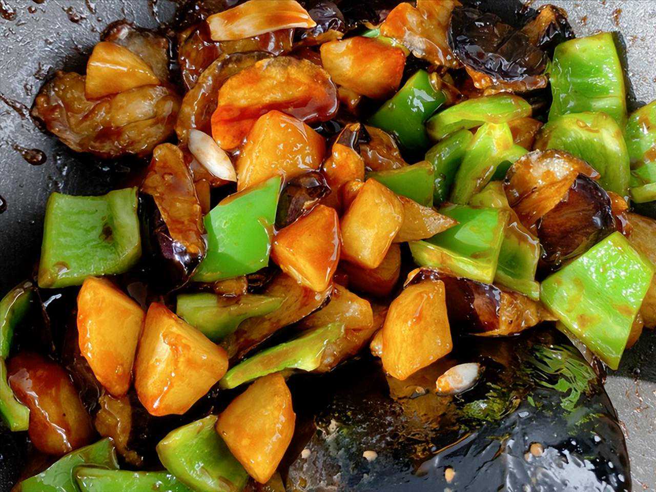 6、收汁完成即可出锅,这道色香味全的地三鲜就制作完成了,颜色闪亮,味道好吃,酸甜美味,鲜香可口,来一碗白米饭,舀入菜汁,孩子都大口吃,毫无压力。
