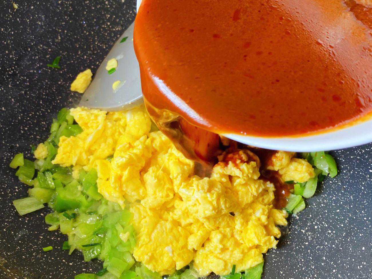 2、重新再放油,倒入葱花爆出香味,接着再倒入炒好的鸡蛋,重新回锅,翻炒均匀。