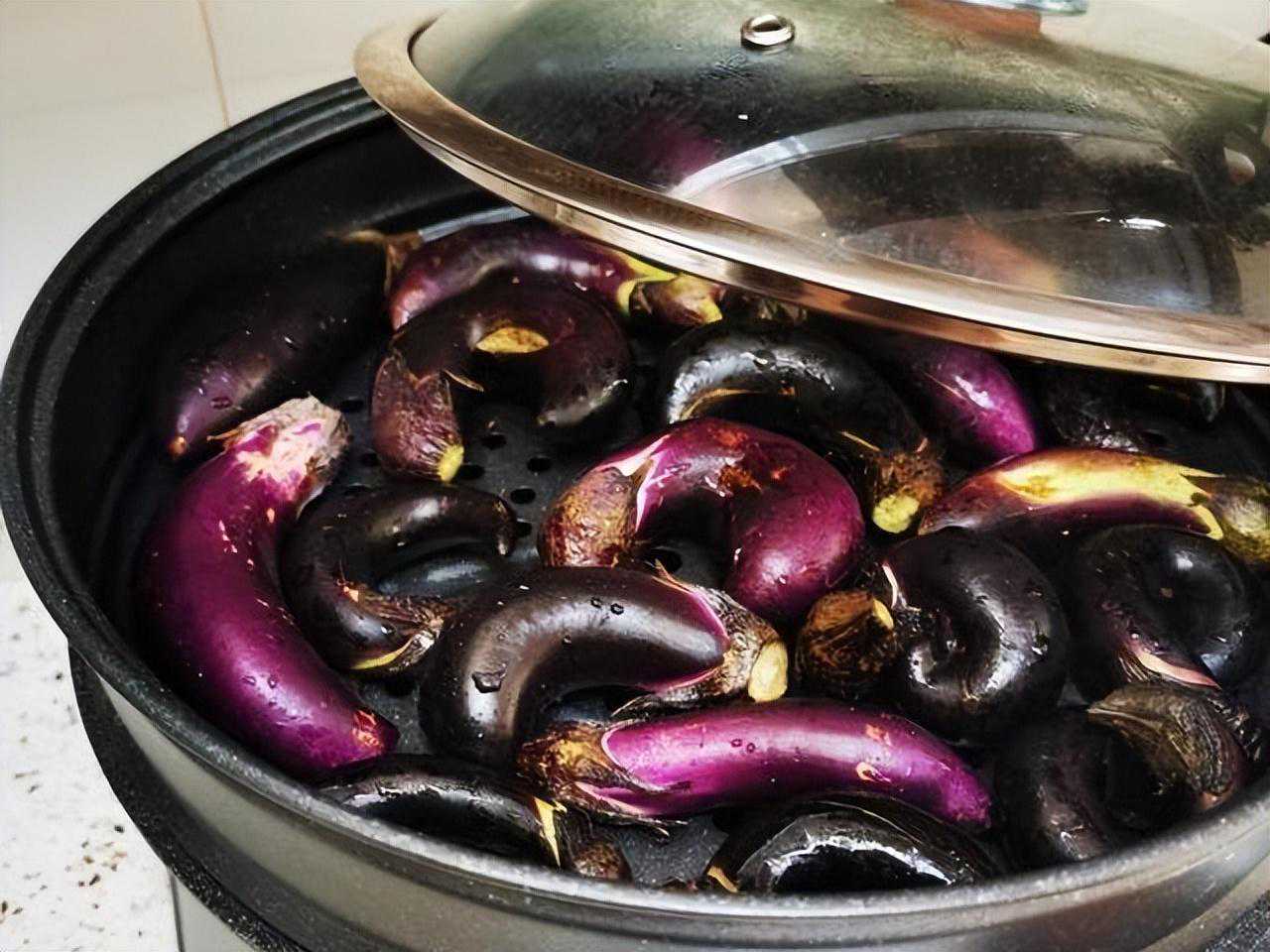2、茄子凉水上锅蒸,从上汽开始算时间,蒸15分钟,看好时间,不宜蒸太久。