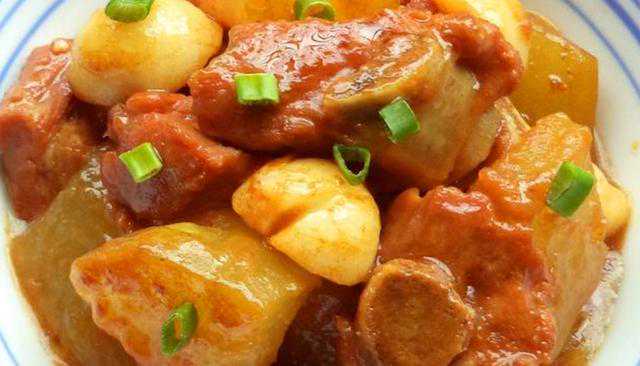 具体做法如下:排骨洗净,入开水锅中焯去血沫,再清洗干净,冬瓜去皮切块,锅中放油,加入八角、桂皮、姜片、蒜片,爆出香味后下入排骨,翻炒几下后下入两小勺料酒,炒匀,再加入1汤匙老抽、1汤匙生抽,加入15克冰糖,加入2汤匙番茄酱,盐1茶匙,炒匀,加入热水,烧开后舀去浮沫,然后盖上锅盖,转小火炖约40分钟,炖40分钟后下入冬瓜,再煮约10分钟至冬瓜熟后下入葱段炒匀即可!
