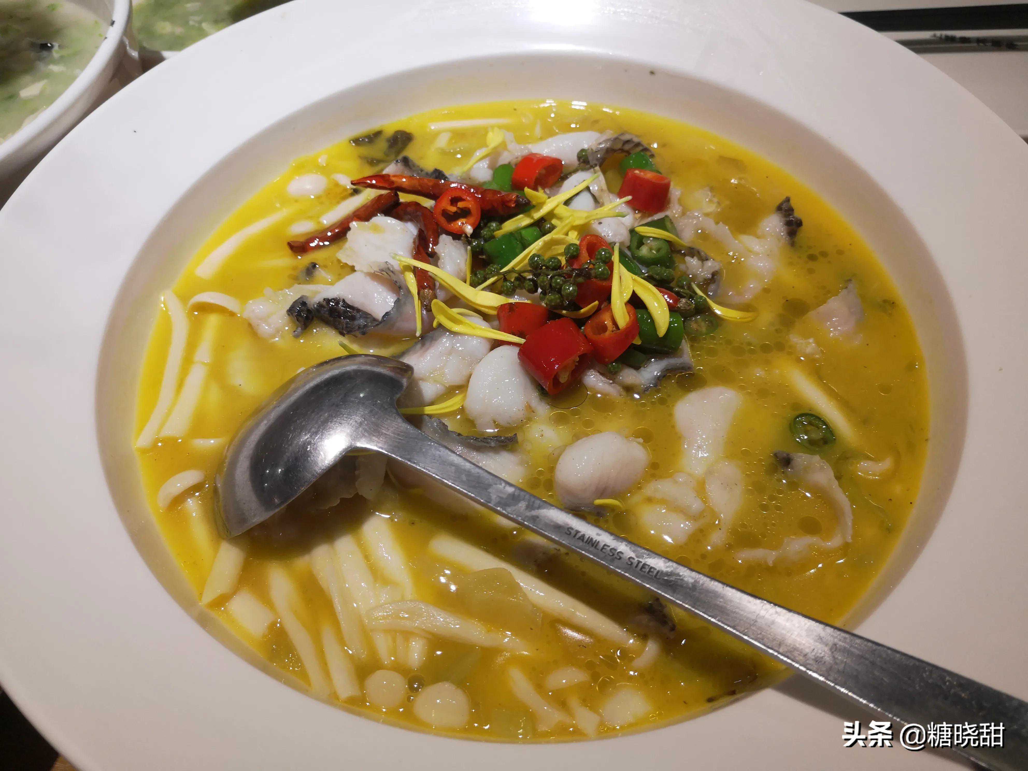 同是酸汤鱼,川菜馆子做就又麻又辣,鲁菜馆子做就基本没有辣味,这个鱼的味道很柔和,突出的是藤椒的麻,汤直接喝都不成问题。