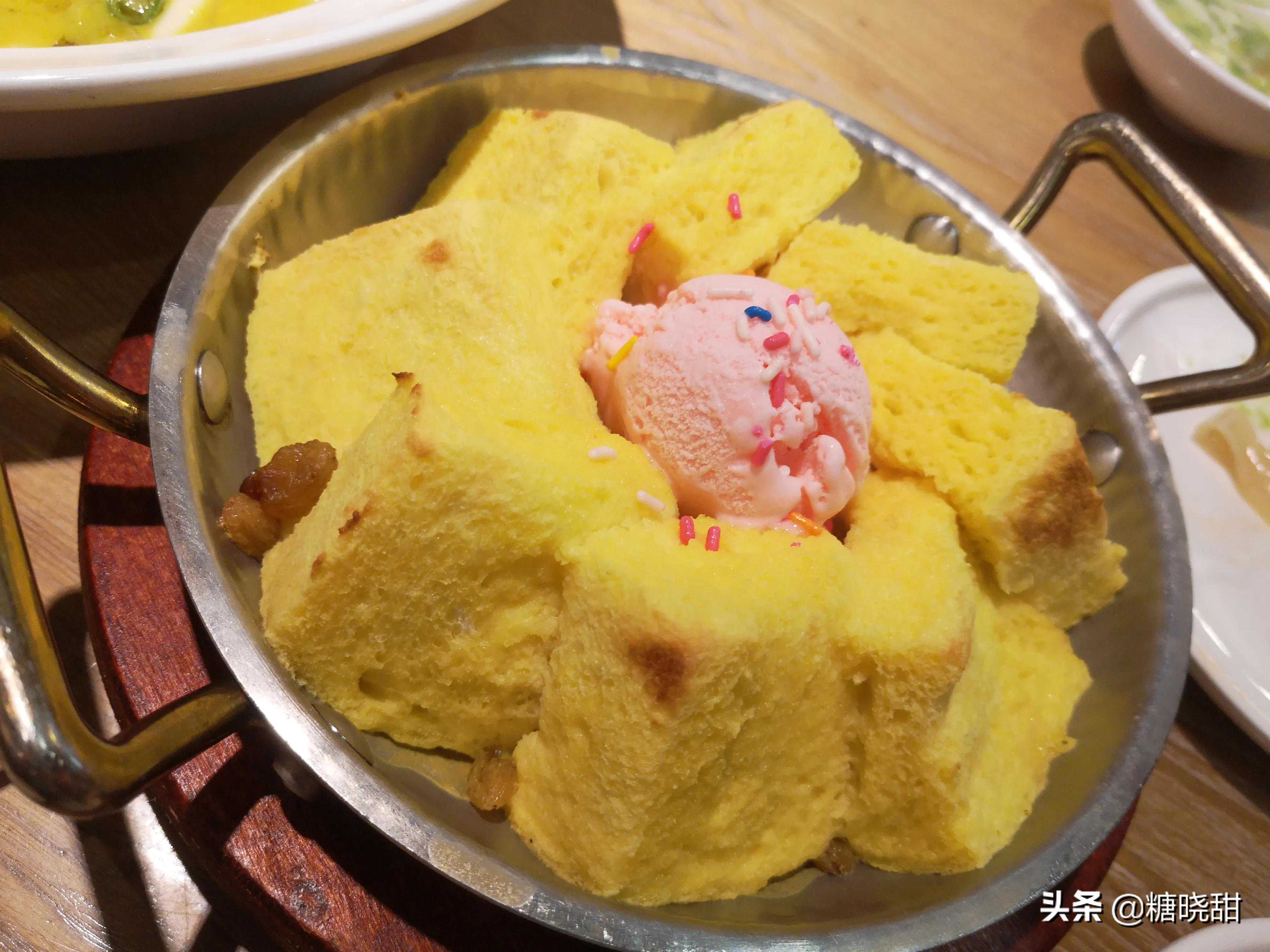 面包是金黄色的,光看外表,以为是蛋糕,吃一口才知道,是面包上面浇了层鸡蛋液再入烤箱烤,热气腾腾的面包松松软软,带着蛋液的香气,搭配快融化的冰激凌吃,口感非常好,小朋友们喜欢,很快瓜分完毕。