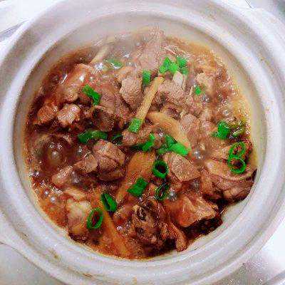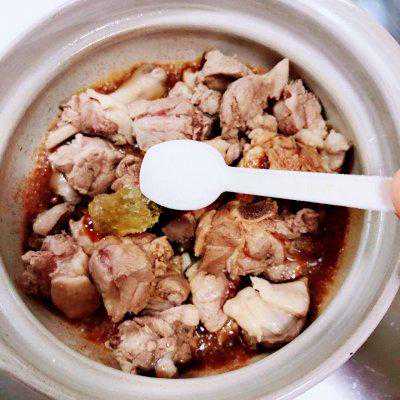 8、将鸭肉放入砂锅中,倒入花雕酒、耗油、生抽。