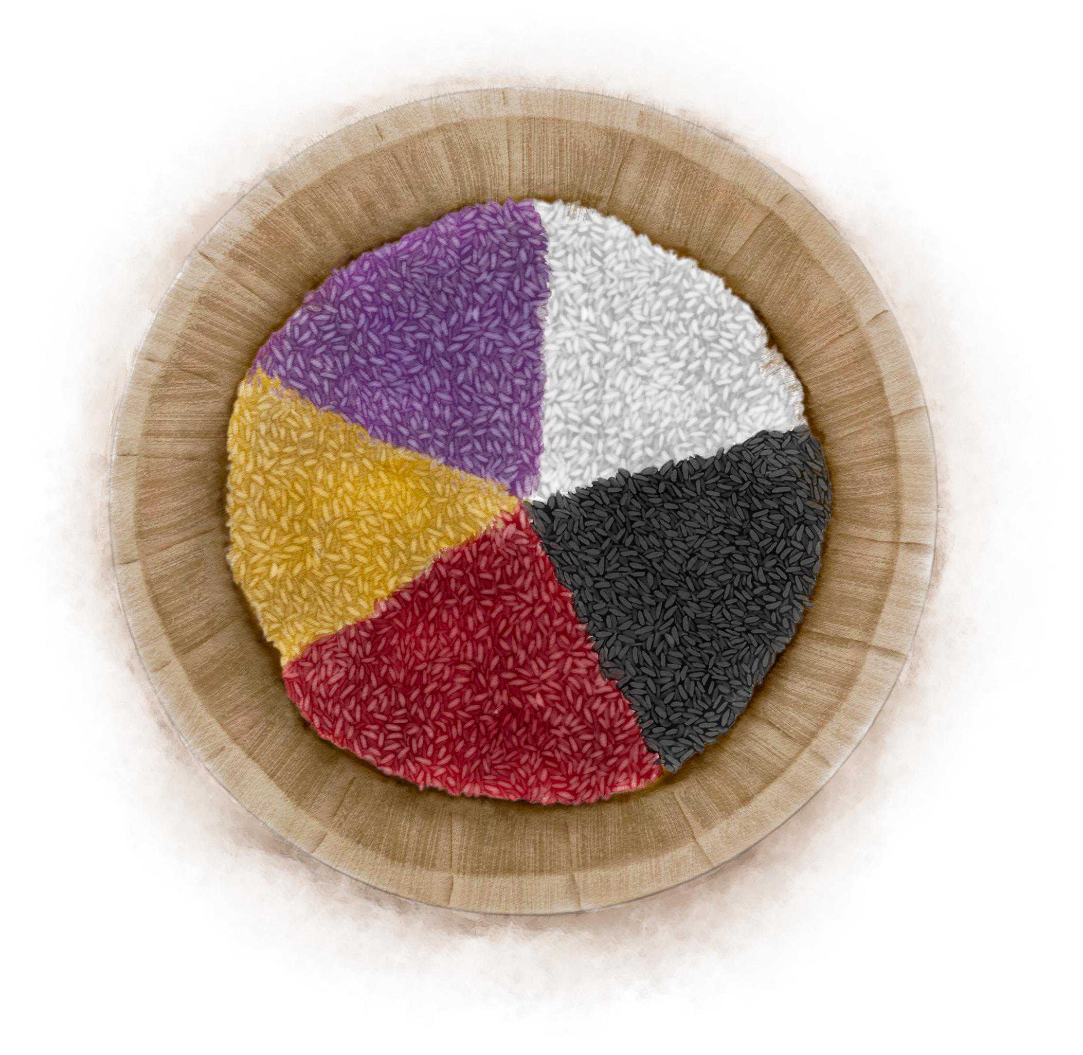 这道有着白、黑、黄、紫、红等几种颜色的糯米饭是用植物染剂将原本是白色的糯米染色,其染剂全部萃取自大自然的花、草、树木和果实,是真正的纯天然染剂。“草木染”是大自然给人类的礼物,早在两千多年前的东周时期已在民间普遍应用,《诗经》中“终朝采绿,不盈一匊”、“终朝采蓝,不盈一襜”中的“绿”和“蓝”便是两种染草,可染出黛色和青色;“缟衣茹藘,聊可与娱”中的茹藘则是茜草,可染红色。“草木染”中包含的是古代先人的经验与智慧,绵延传承,直到今天。