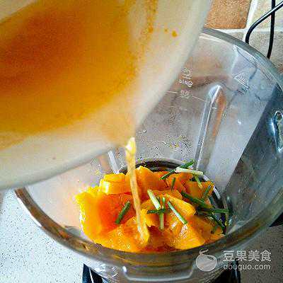 3、把煮熟的南瓜土豆和煮南瓜的水一起放入料理机,加入葱段。