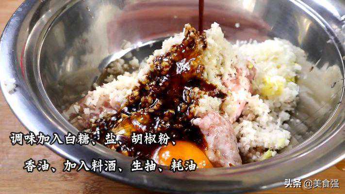 肉馅要自己手工剁,辅助食材香菇、马蹄、葱姜蒜剁碎加入,肉中加入一个鸡蛋,白糖、盐、胡椒粉、香油、料酒、生抽、耗油。拌匀备用