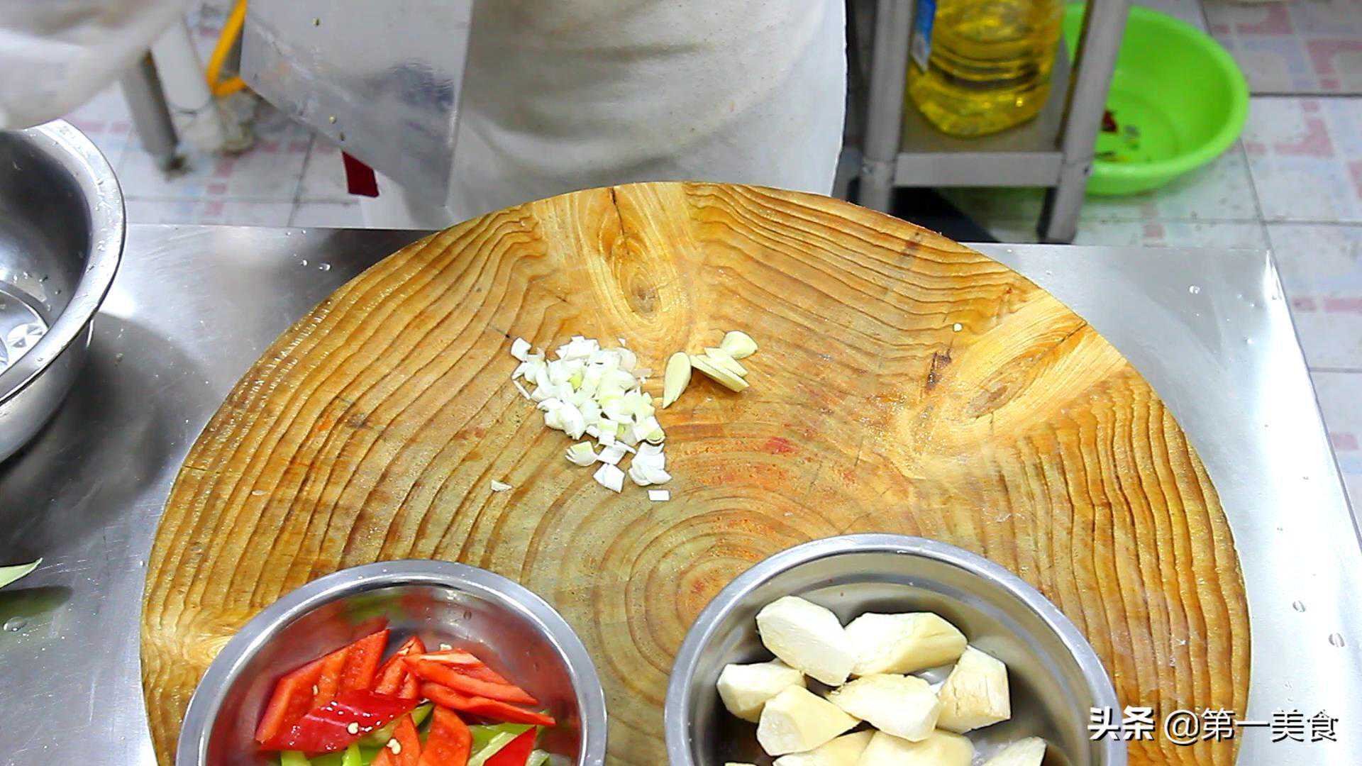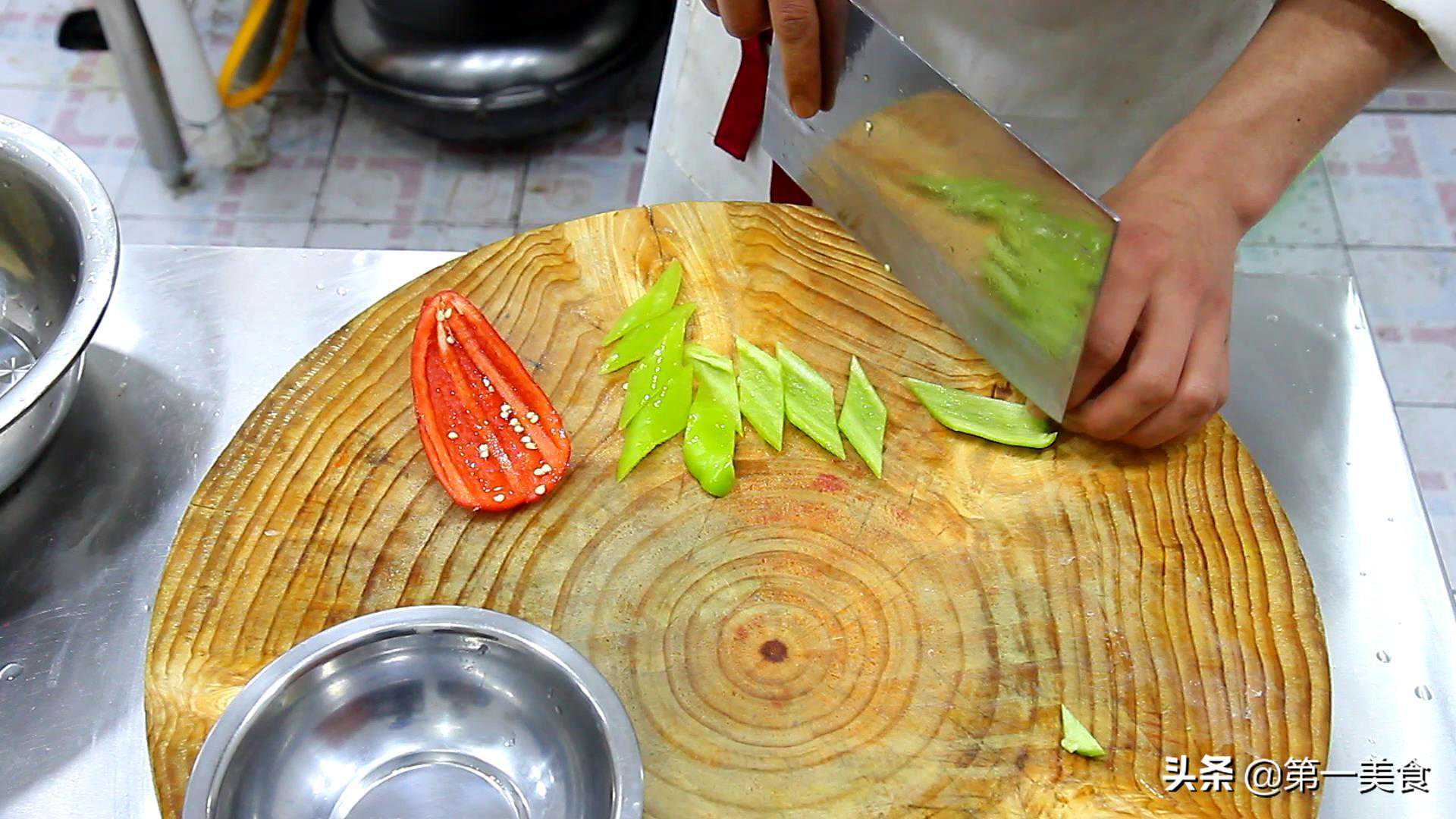 2.红椒半个,青椒半个,去籽后,切成菱形片放在盘里,用来配色。