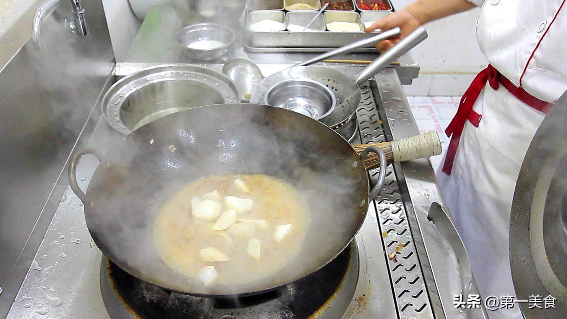 8.十分钟以后,掀开锅盖,倒入杏鲍菇,再煮二分钟,加入食盐,白糖,鸡粉,胡椒粉,快速翻炒,化开调料。