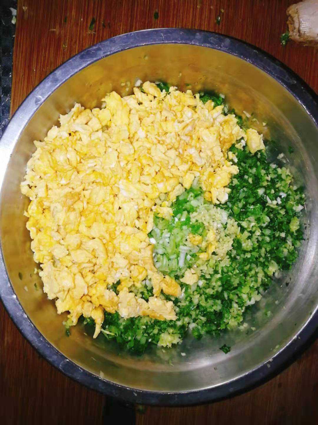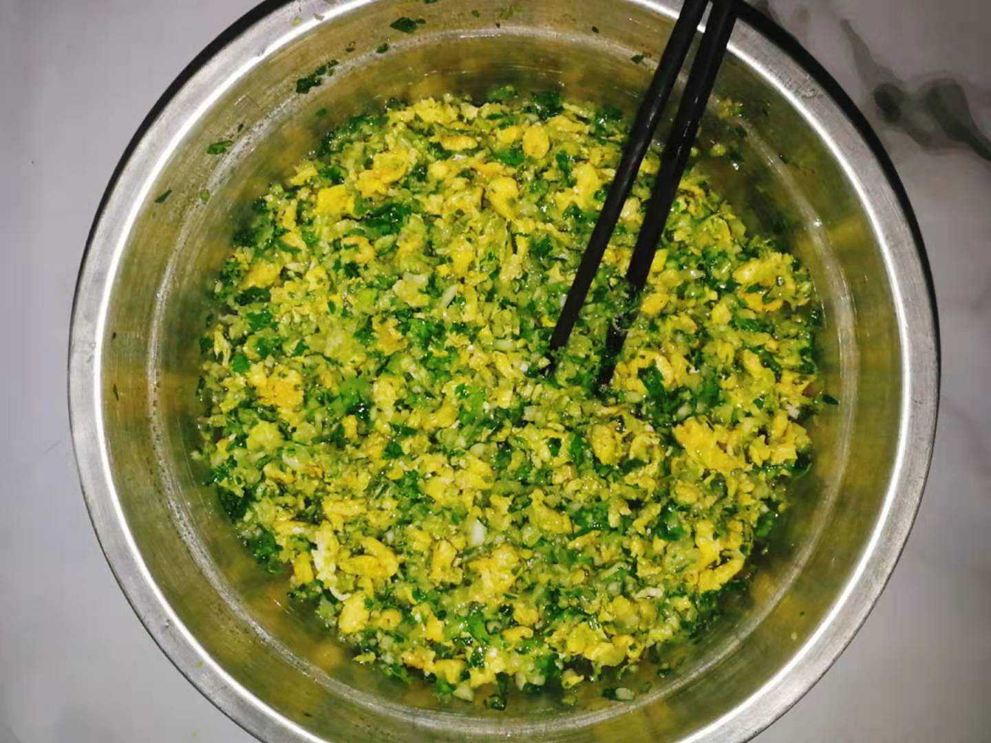 第一步:准备馅料芹菜和卷心菜洗净剁碎,剁的时候加入少量盐,将菜里的水分杀出来,然后挤干水分,可以防止馅料出汤;葱姜切成碎末;鸡蛋打散炒熟弄成小块与菜放在一起