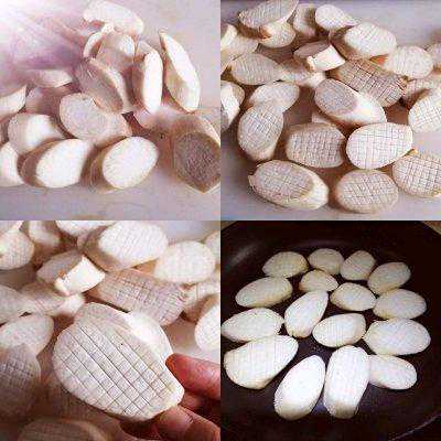 2、把杏鲍菇切成1公分厚的片,两面都切上十字花刀。