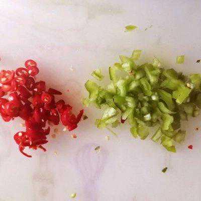 7、两根红尖椒切碎,少许青椒切碎。