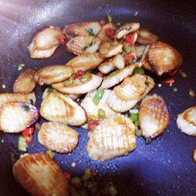 9、然后下入杏鲍菇片快速翻炒。