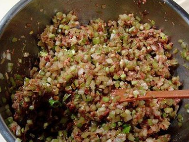 步骤二:芹菜切成小块,和搅碎的肉末搅拌均匀,再放入适量的料酒,十三香,生抽和食用盐进行调味。