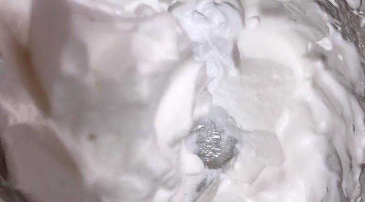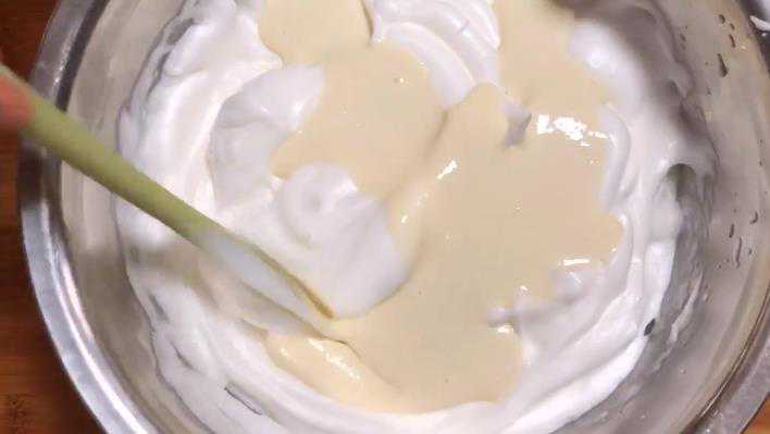 5.[奶粉液+蛋白霜]:搅把酸奶和奶粉再次搅拌均匀,倒入蛋白霜里面。一只手转动盘子,另一只手用上下翻拌的方式,把蛋白霜翻拌均匀。