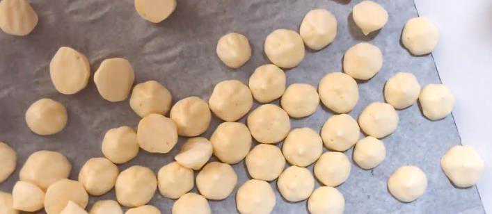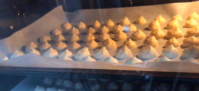 7.[挤溶豆]:烤盘把做好的溶豆挤在上面。两个溶豆之间的距离不用相差太大。