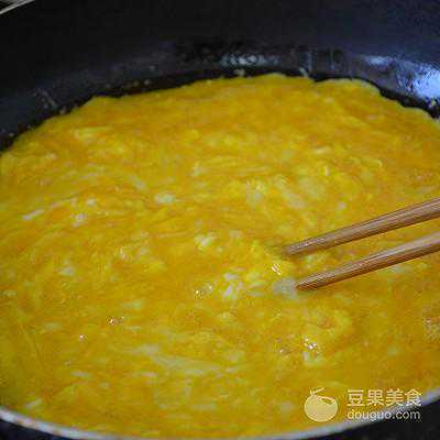 8、锅内放1勺花生油,油微热倒入鸡蛋液。