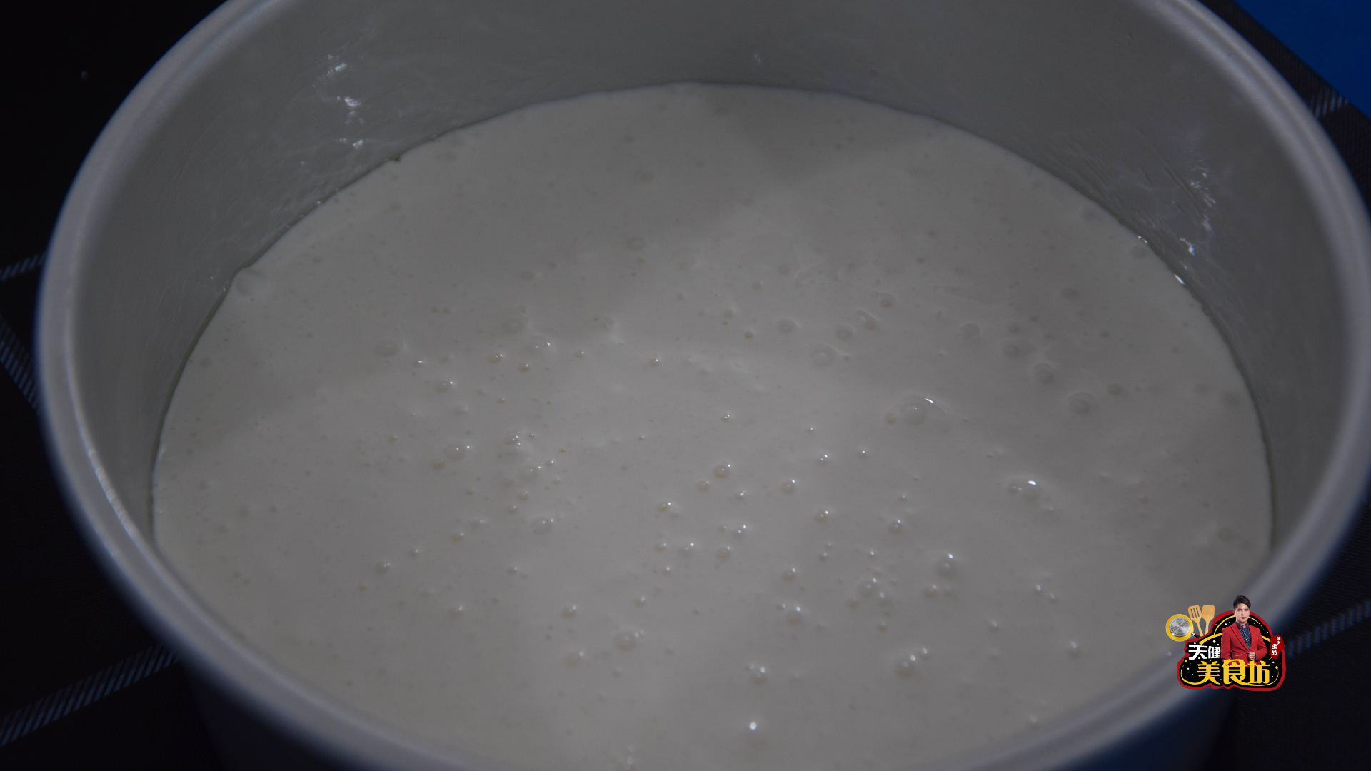 第四步:等米糊发酵好之后,准备一个8寸的蛋糕模具,然后将米糊转移到模具里面,再提起模具稍微地震动几下,将米糊里面的起泡震出来。