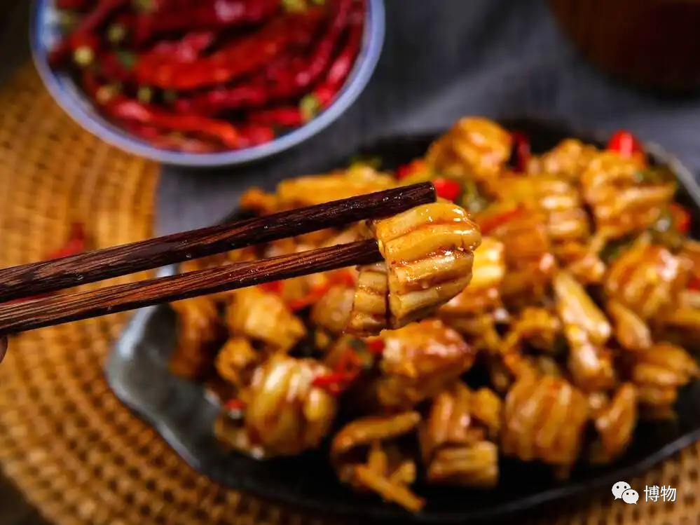 天梯的口感非常脆,嚼起来咯吱咯吱的,最符合川渝人对火锅食材口感的要求。其实天梯不仅可以涮着吃,更适合爆炒。火要极旺,天梯一下锅就会打卷,就像鱿鱼花那样。